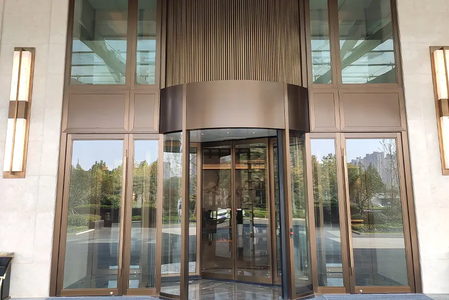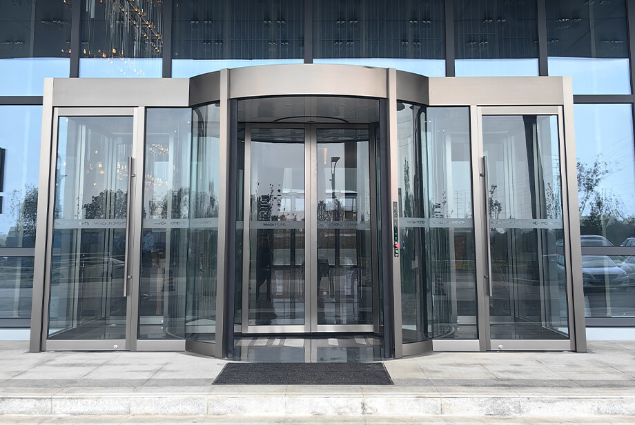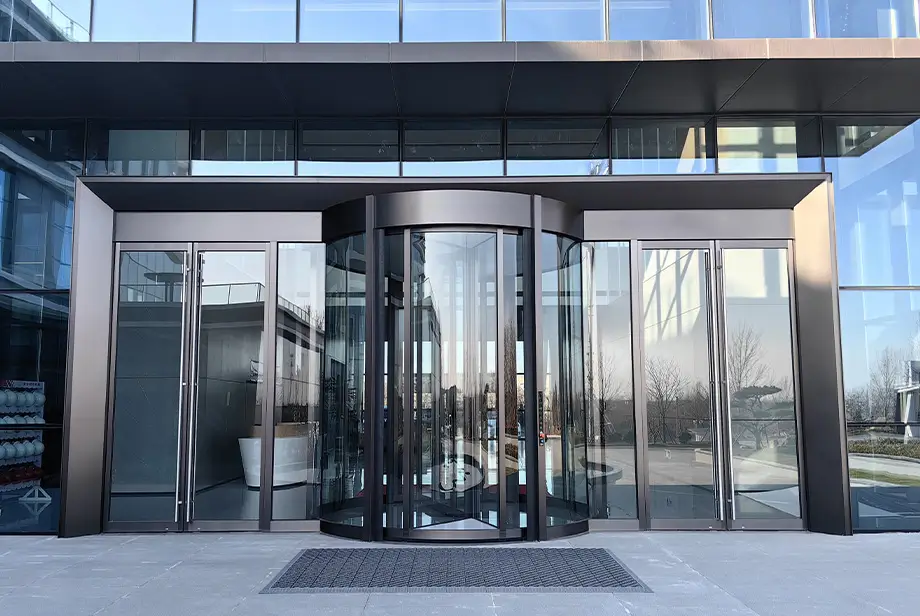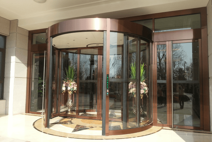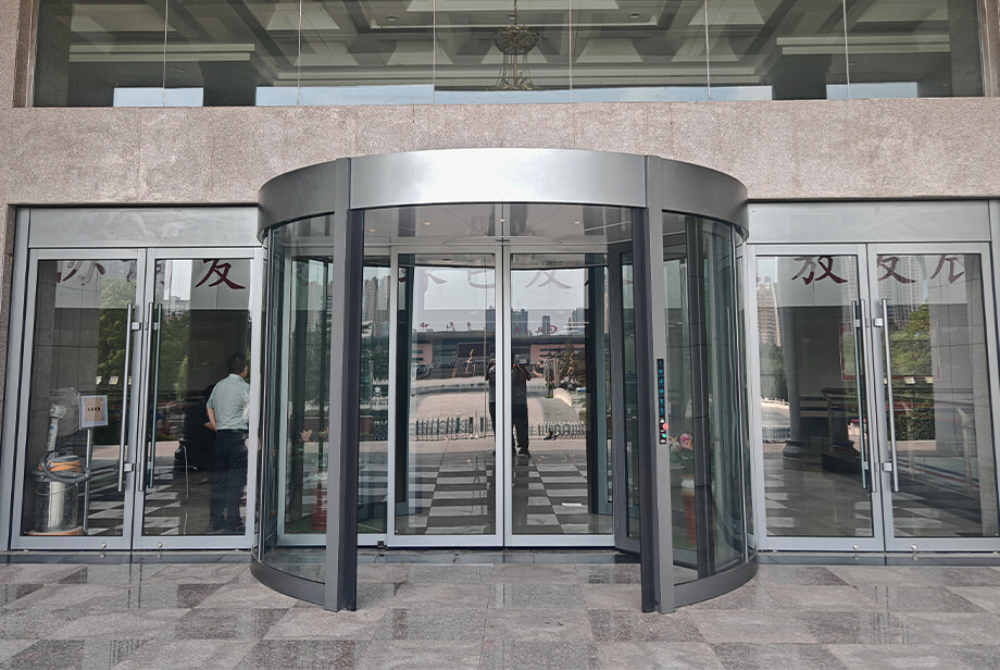 Two-sided automatic rotating doors + single-panel sliding doors + upper layer glass
