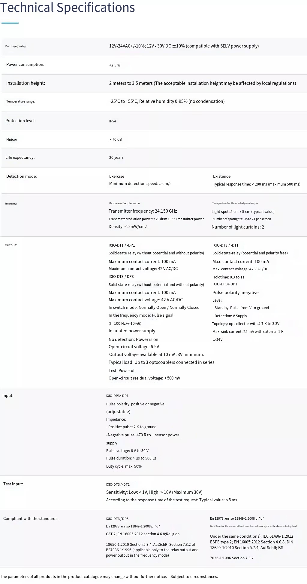 The IXIO-D sensor opens the door using microwave technology and provides user protection throughinfrared technology. One-way microwave can achieve energy savings. The three-dimensional infrared lightcurtain can prevent people from colliding with the door. Thanks to the LCD screen and BEA decoder, theconfiguration of the application sensor has never been so simple.