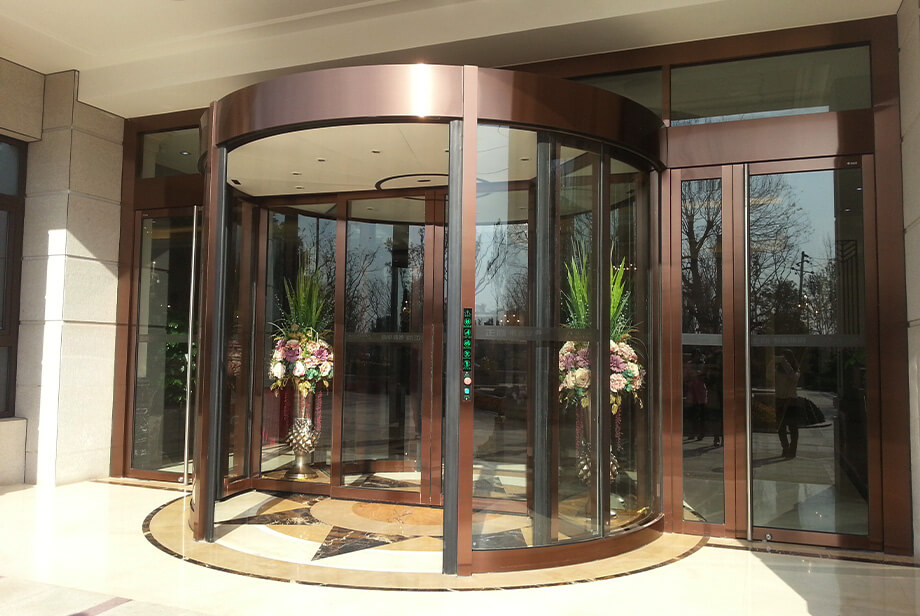Standard inner diameter range 3600mm to 4000mm, entrance width up to 1580mm to 2200mm, standard door leaf height 2600mm to 3000mm, canopy height mostly 300mm or 400mm. Power supply is AC 220V ± 10%, 50Hz, total rated power 610W to 1450W, with revolving door motor power 500W to 800W and accompanying sliding door power 60W to 150W. Operating noise ≤ 60dB, speed adjustment range 3 to 6 revolutions per minute, normal throughput 32 to 40 people per minute.